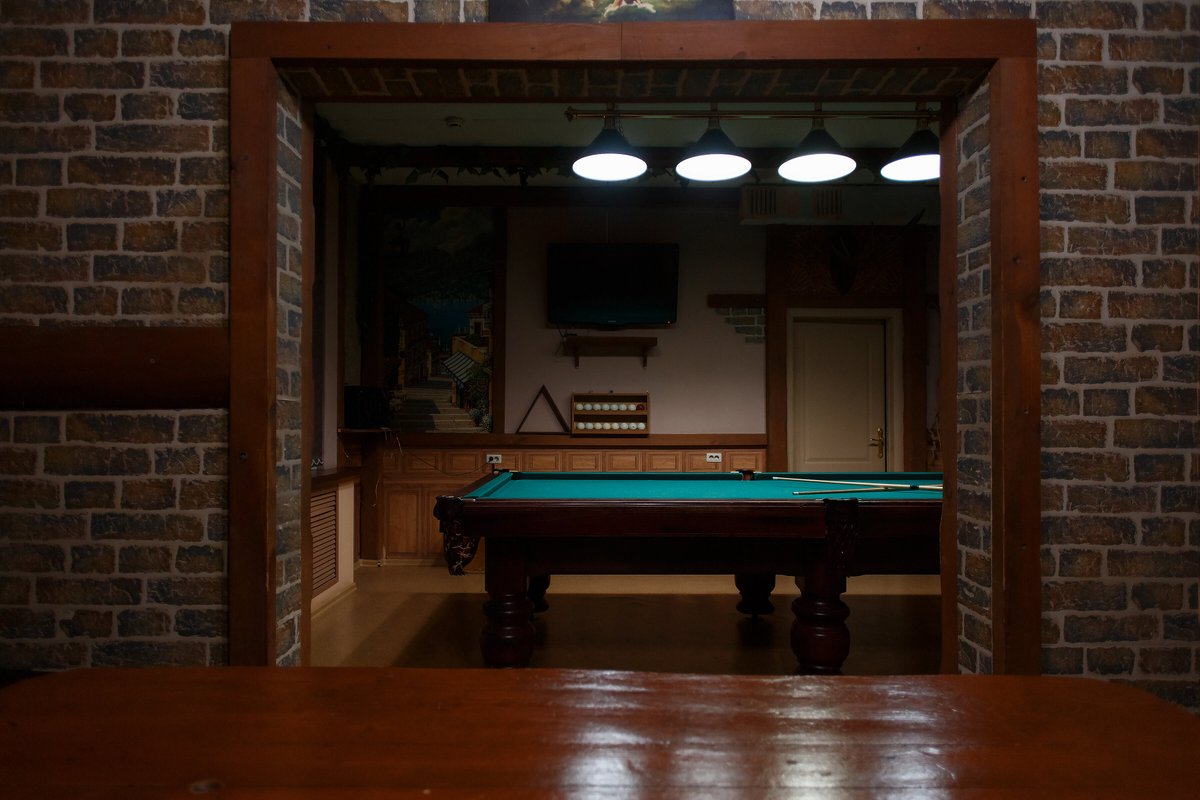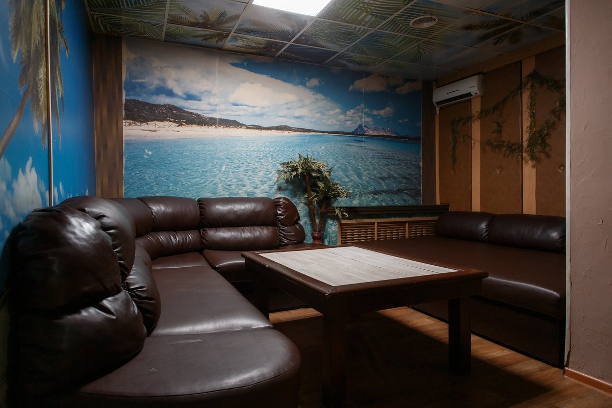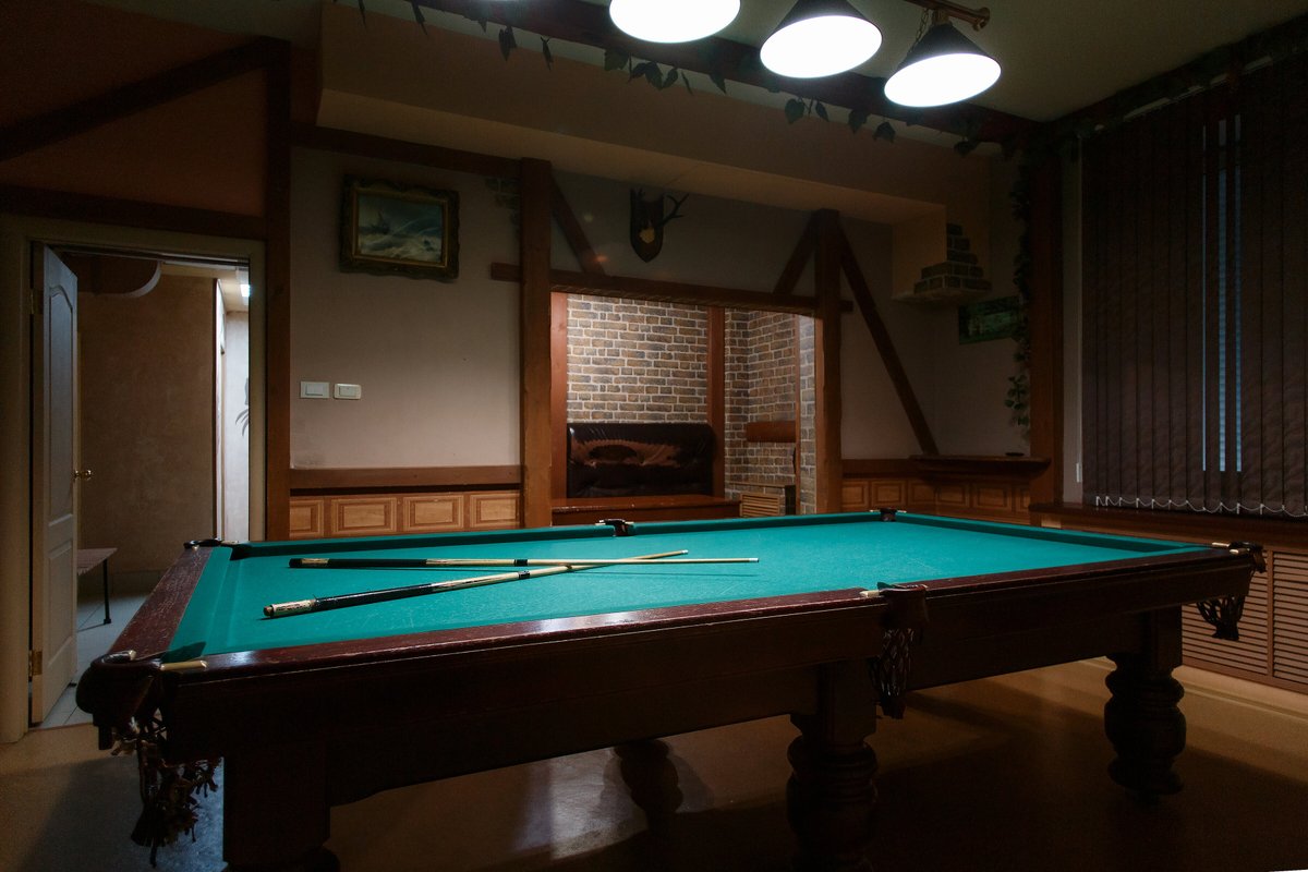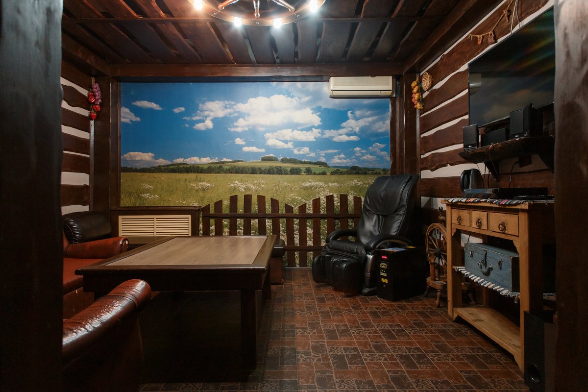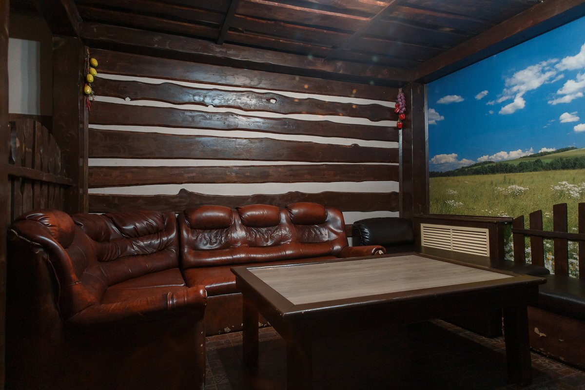 Не хочется в бассейн? Не проблема! Вместо этого можно провести время в нашей комнате отдыха. Мы постарались создать здесь комфортный, стильный интерьер из максимально натуральных, экологичных материалов, выбрать мебель, которая будет одновременно удобной и приятной глазу. Надеемся, что вам понравится! Для создания настроения у нас есть бильярд и караоке. Также у нас работает бар, где вы можете заказать блюда русской кухни, а если нужно, прийти и со своей едой - мы не против! Только не забывайте, что плотная трапеза непосредственно перед посещением парной - это не самая хорошая идея, согласно мнению врачей. А вот после парной она совсем не повредит!